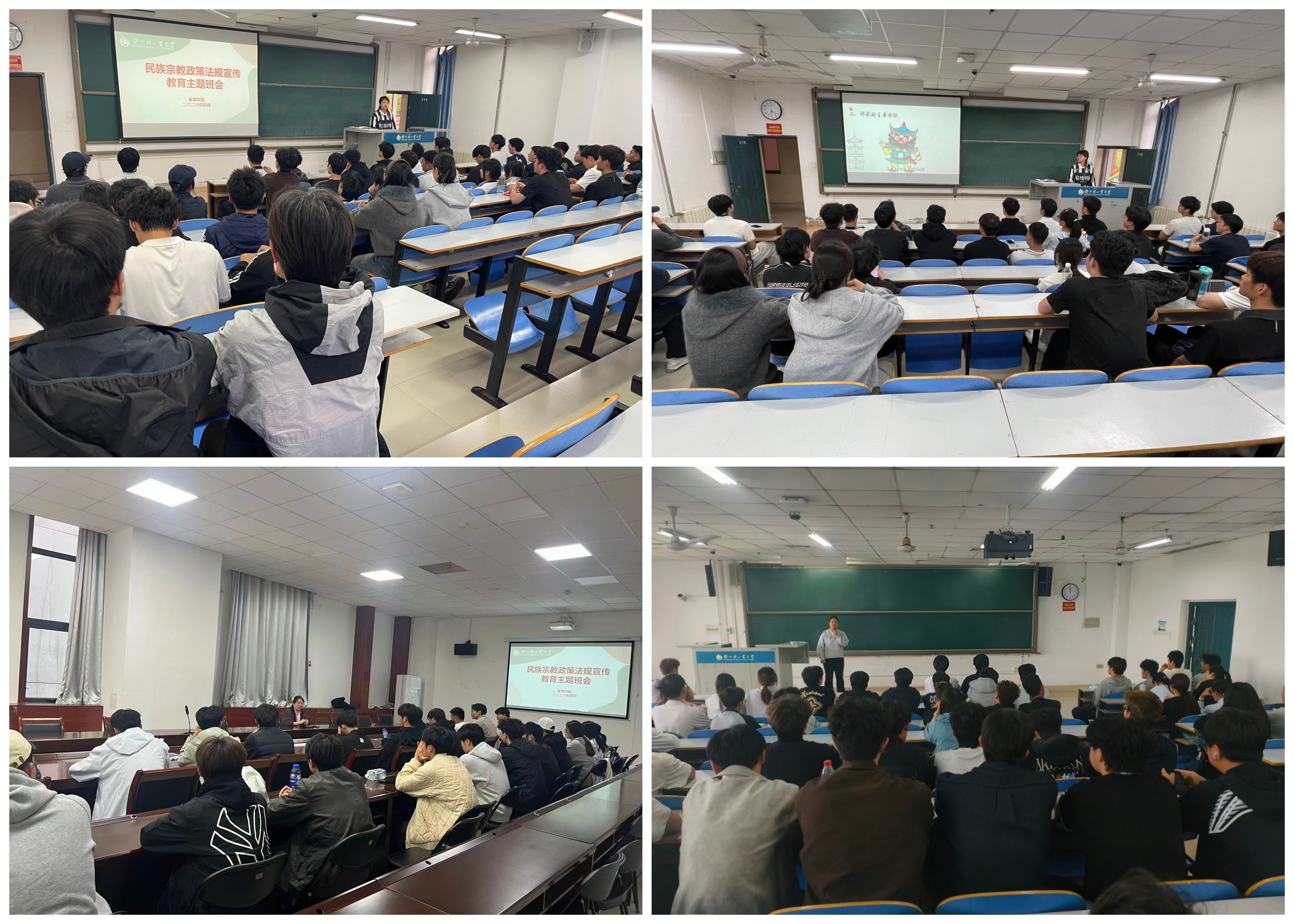 班会上,各辅导员用通俗易懂的语言和贴合实际的典型案例,带领学生深入学习习近平总书记关于加强和改进民族工作的重要思想、关于宗教工作的重要论述,并系统解读了我国民族政策、民族区域自治制度及宗教信仰自由政策,剖析非法宗教活动及境外宗教渗透对校园安全、学生成长的危害,重点阐释了“中华民族共同体意识”的核心要义和“四个与共”理念。依据《中华人民共和国教育法》,明确教育与宗教相分离原则和我国宗教政策的法律边界,强调校园内不得举行任何形式的宗教活动。同时,各班通过PPT展示、观看视频、案例分析等多种形式,引导学生坚定理想信念,厚植爱国情怀,以科学理性的态度看待宗教问题,增强学生法治意识和辨别能力。